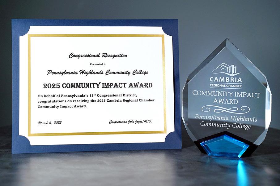The Cambria Regional Chamber presented Pennsylvania Highlands Community College with a Community Impact Award. This prestigious award recognizes the College for its dedication to investing in the region, fostering social responsibility, and taking meaningful actions that uplift the community.