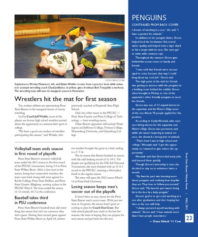 I dreamt of working in a zoo,” she said. “I have a passion for animals.” In addition to her penguin duties, Green helped feed the freshwater fish, tested water quality, and helped train a tiger shark to hit a target with its nose. She even got to swim with cownose rays. Throughout the summer Green gave behind-the-scenes tours to family and friends. “I was told that friends were encouraged to come because that way I could brag about my cool job,” Green said. The high point of the visit for friends was getting to interact with the penguins in a holding room behind the exhibit. Green often brought in Mickey or one of the aquarium’s other friendly penguins to meet her friends. Green was one of 12 unpaid interns in the aquarium and the Water’s Edge areas of the zoo. About 70 people applied for the position. According to Kathy Wozniak, who oversees hiring interns for the aquarium and Water’s Edge, Green was persistent, and while she wasn’t majoring in animal science, she showed a strong love of animals. “That’s how I was in high school and college,” Wozniak said. “I got the opportunity, so I wanted to give others the opportunity.” Wozniak said that Green had many jobs and learned them quickly. Though Green’s internship is over, she decided to stay on to volunteer twice a month. “My favorite part was learning more about penguins and realizing how dog-like they are. They love to follow you around,” Green said. “My favorite part wasn’t being bit in the face by a baby penguin.” Green’s goal is to get a job working at a zoo after graduation, and she’s hoping her time at the zoo will help. “I always pictured myself working with animals,” Green said. “I love animals more than I love people sometimes.”
