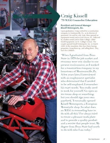 ’79 M.Ed. Counselor Education President and General Manager Kissell Motorsports, Inc. Upon graduation, Craig worked for a construction company in Montoursville, Pa., as its director of personnel. He and his wife, Kate, then opened an equipment rental yard in Lock Haven, Pa., followed by another rental yard in State College, called Kissell Equipment, on W. College Avenue. The couple opened Kissell Motorsports, Inc. in March 2000. In the meantime, they have been buying properties, fixing them up, and selling them. They have five children.