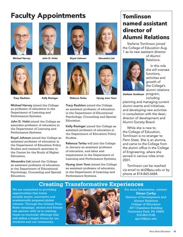 In this role she will oversee functions, activities and growth of the College’s alumni relations Stefanie Tomlinson program, including planning and managing current alumni events and initiatives, and developing new activities in consultation with the dean, director of development and Alumni Society Board. While she is new to the College of Education, Tomlinson is no stranger to Penn State. She is an alumna, and came to the College from the alumni office in the College of Engineering, where she served in various roles since 2001. Tomlinson can be reached via email to skt2@psu.edu or by phone at 814-865-6684.