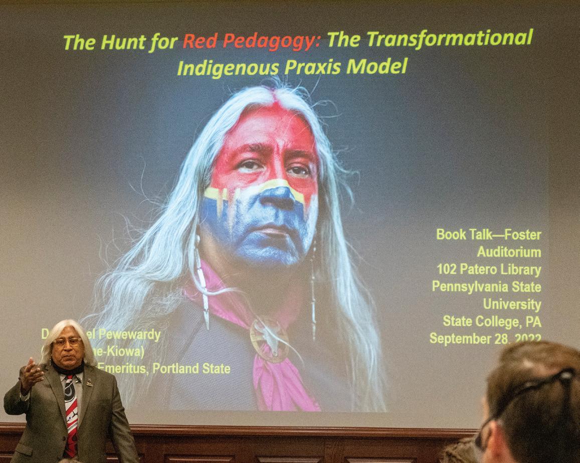 The Alumni Fellow program is administered by the Penn State Alumni Association in cooperation with the University’s academic colleges, campuses and the Office of the President. Alumni are nominated by a college or campus as leaders in their professional fields and accept an invitation from the president of the University to return to campus to share their expertise with students, faculty and administrators. During his time on campus, Pewewardy gave a book talk, “The Hunt for Red Pedagogy: The Transformational Indigenous Praxis Model.”
