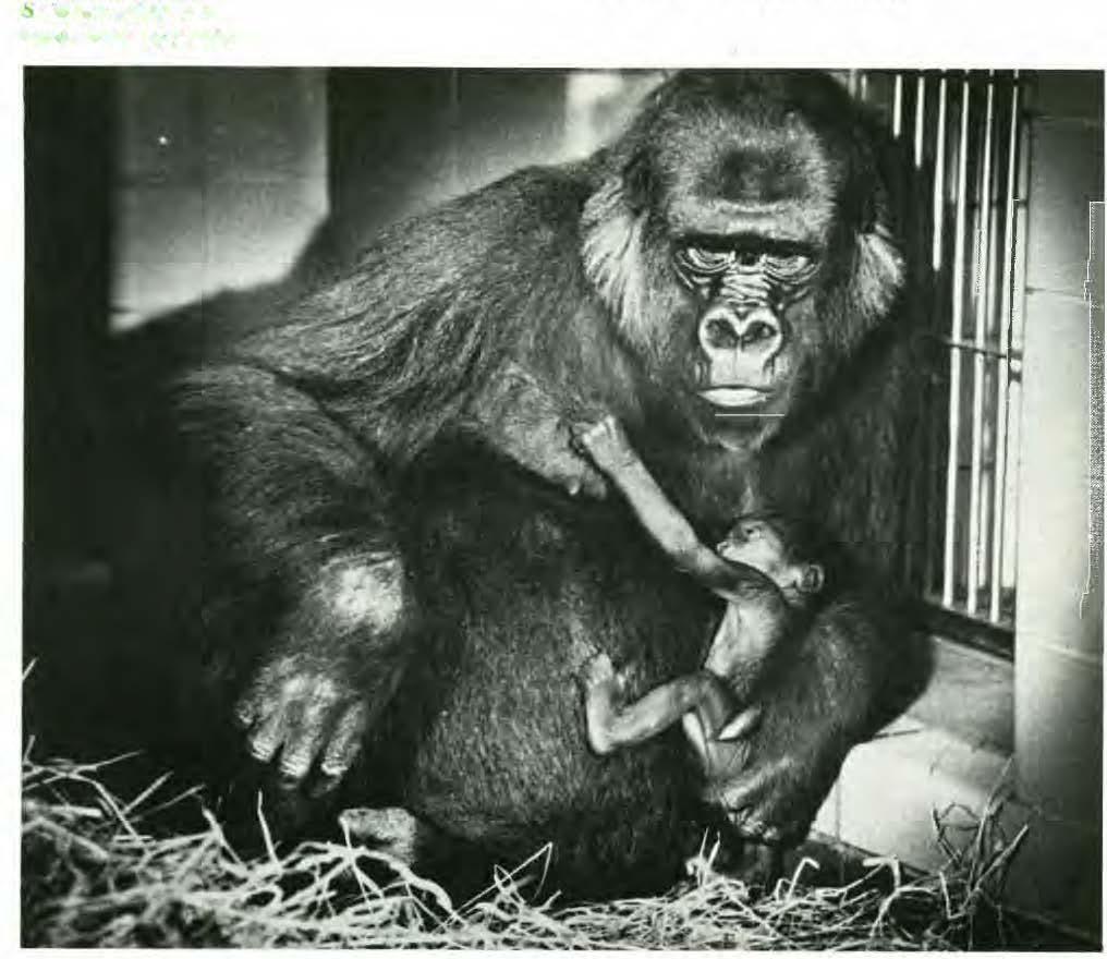 Snickers, Samantha, and John arrived at the Zoo along with two other males, Tohy and Bobby, in 1969. At that time the Zoo became interested in the 1reatn1ent of primates in captivity. It was impo�ible to duplicate the envi· ronmcnt of the wild gorilla in the Rare Mam· mal Honse where the gorillas were housed. The facilities are poor and the cages are too smaJI to foster much group interaction. Yet Dr. Robert Snyder, Director of the Penrose Laho· ratory, believed that some aspects of the social group should and could be reconstructed. He especially stresHed the importance of a close mother/infant relation�ship. Each animal was placed with a surrogate mother (a zoo keeper) who remained with the gorilla seven days a week for three yearH. All of the gorillas also ate and played together in their early years under the guidance of animaf specialists.