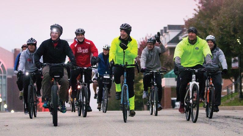 Despite below-freezing temperatures, faculty, staff and students accompany Daniel Greenstein (center), chancellor of Pennsylvania's State System of Higher Education, on an early-morning bike ride through California and the Cal U campus. Greenstein, an avid cyclist, visited each of the System's 14 universities this fall, and he began many of those visits with a bicycle ride.