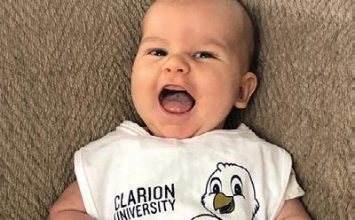 To receive a bib, visit www.clarion.edu/babybib and complete the online form. Once you receive your bib, take a picture of your Eaglet putting the bib to use, and email a high-resolution photo to us for inclusion in Clarion University Magazine.