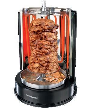 auf dem großen Metallspieß dreht sich Ihr Grillgut um 360° und wird von allen Seiten gleichmäßig gegart inkl. 6 zusätzlicher Spieße für Schaschlik, welche sich unabhängig vom Metallspieß um ihre eigene Achse drehen Fassungsvermögen bis zu ca. 2 kg Fleisch Größe: ca. 25 x 25 x 36 cm pro Stück