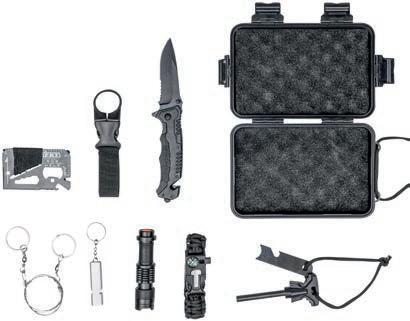 Aufbewahrungsbox gefüllt mit vielen nützlichen Helfern, z.B.: Feuerstein, Taschenlampe, Armband mit Kompass u.v.m. pro Set