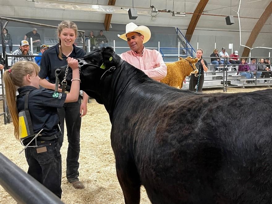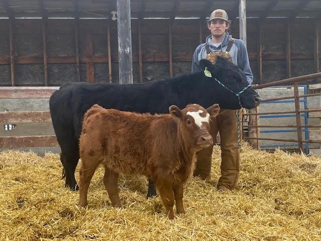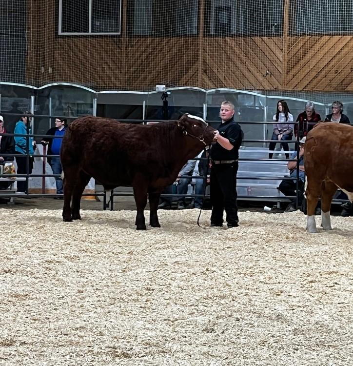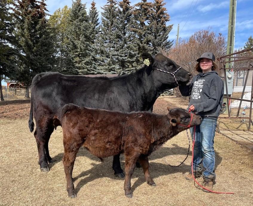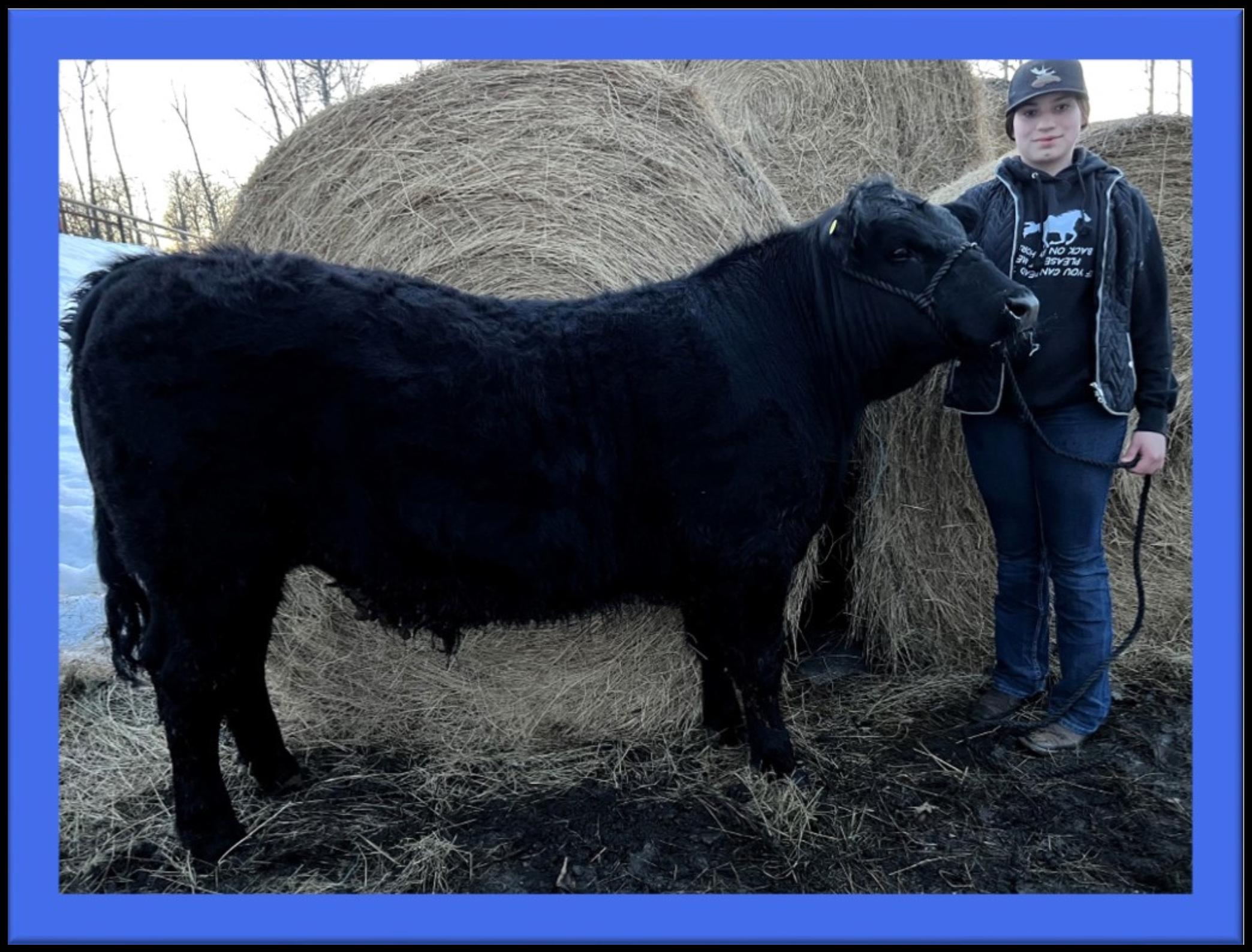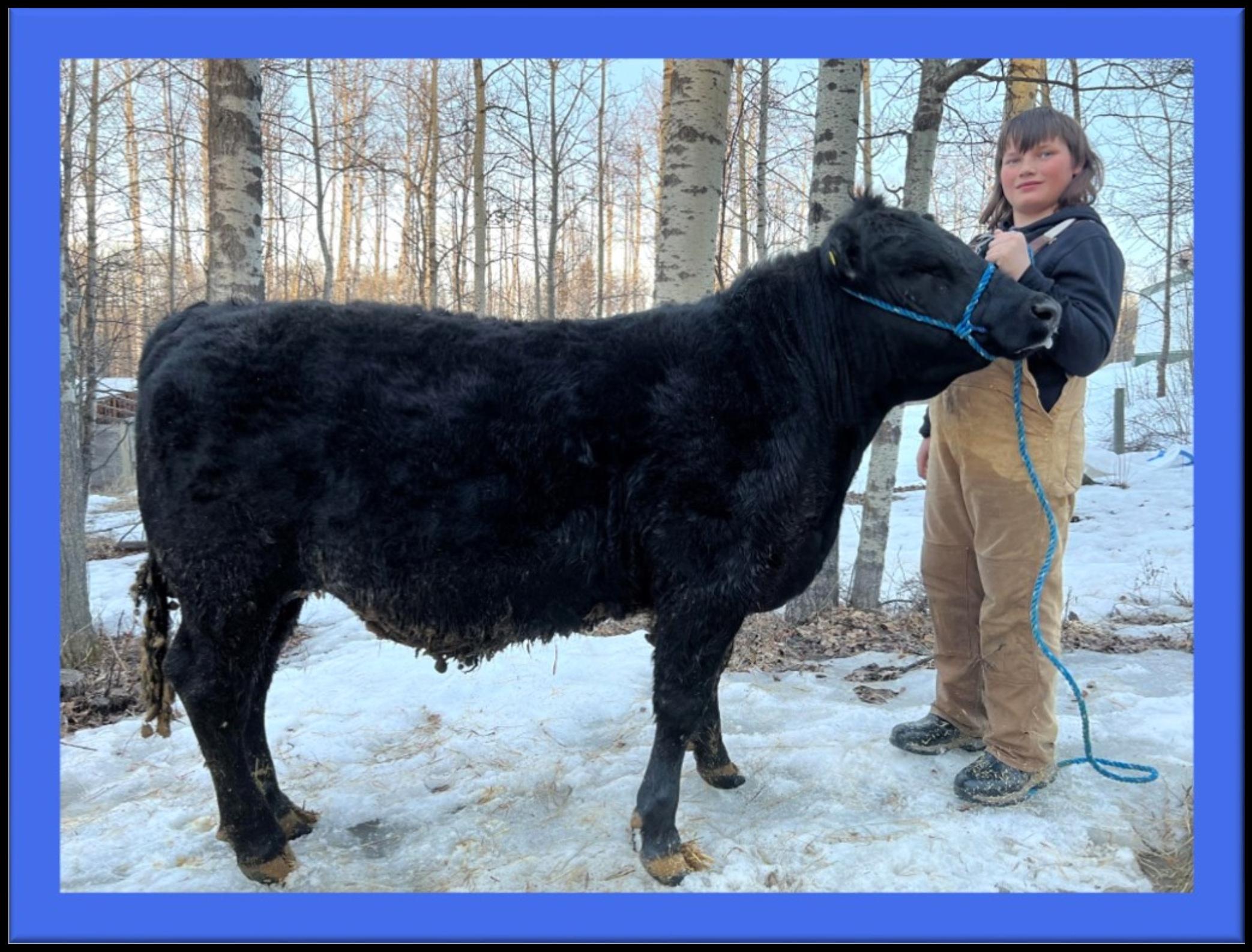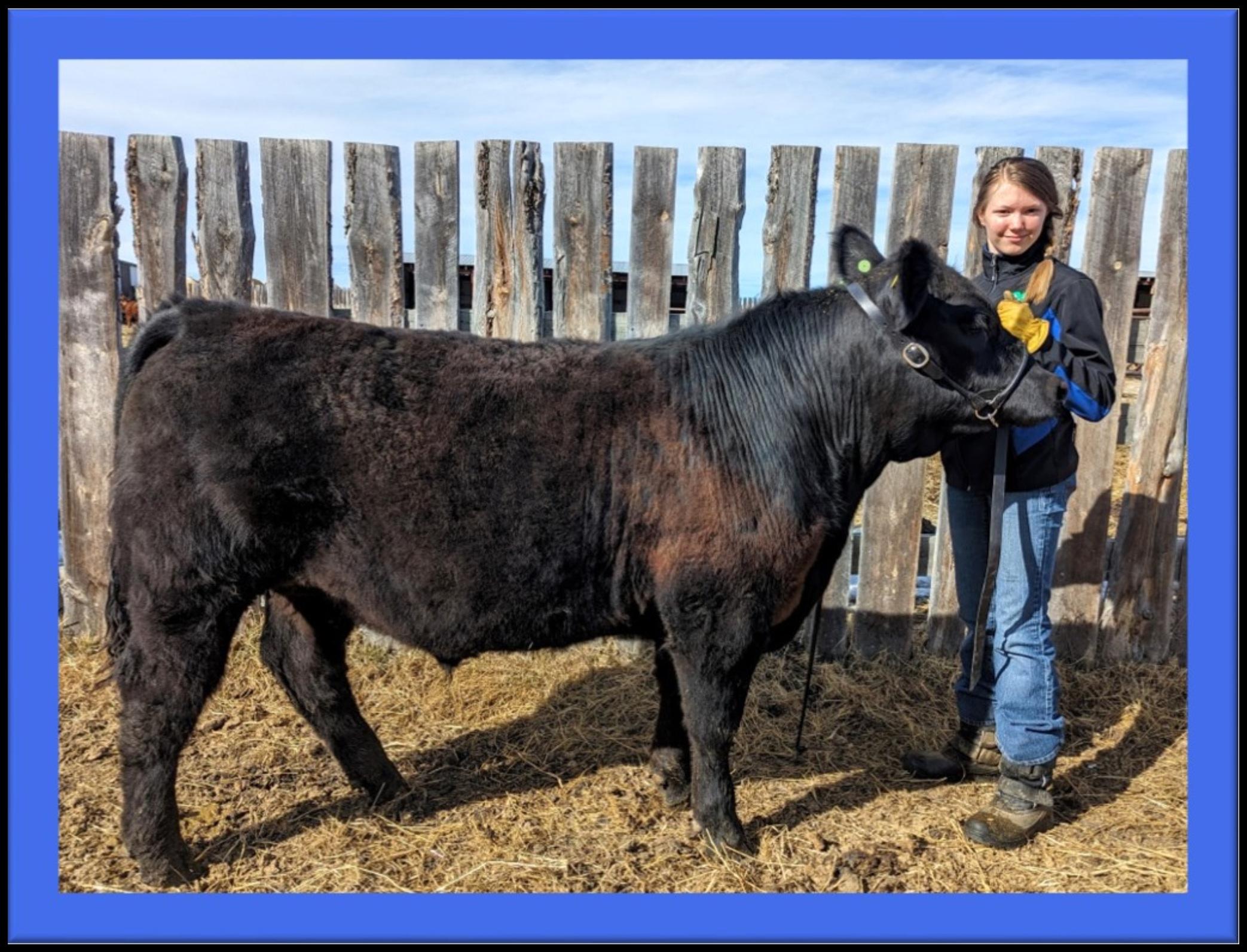 Hey, I’m Timory Nicolay and I’d like to introduce you to my stunning Simmental/Angus steer named Kero. I can’t decide if he’s good or bad, but we have gone on some adventures together. For example, the first day he kicked me. Thankfully though, he didn’t hurt me. He also likes to play games with me, like ‘Yeah, Right, Try and Halter Me’ and ‘Cop and Runner’ (in which I'm always the cop.) Besides his attitude, he’s a good steer who enjoys his daily feed of 4-H ration, barley and pellets. From the beginning he was a big calf weighing in at the October Weigh-In at 714 lbs. He’s a good-looking calf featuring a nice shiny black coat. I hope this was enough to convince you to come and meet him at our show and sale on May 25, 2023, and maybe place a bid. If not on him then maybe on one of the other great steers our clubs have on offer!