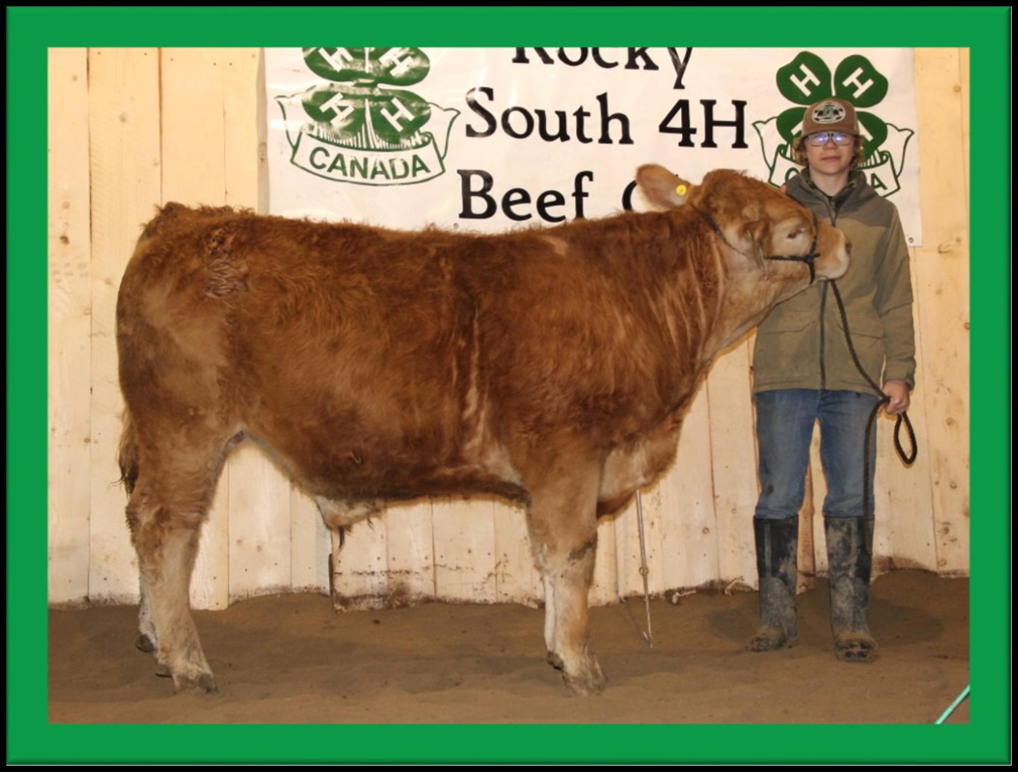 Hi, my name is Levi Gerdung, and I am proud to be bringing you a fantastic looking animal. I present another Limousine Angus X, named by his gentleness, Ferdinand the gentle steer! He was born in Elnora, AB and has been trained and fed on an acreage outside of Caroline, AB. Now let me fill you in on my background. As I have said, my name is Levi, and I am a 17 year old teen. I am a member of the Rocky South 4-H Beef Club. My hobbies include fishing, camping, hunting, hiking, quadding, 4-H, and hanging out with friends. I would like to say thank you to BUNCH PROJECTS for purchasing my last year’s steer. As well, Ferdinand and I hope to see all of you at our Show and Sale in May. Please come out and support both the North and South Beef Clubs. Happy Trails!