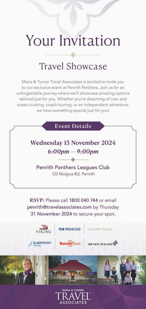 Maria&TurnerTravelAssociatesisexcitedtoinviteyoutoour exclusive event at Penrith Panthers Join us for an unforgettable journey where we’ll showcase amazing options tailored just for you. Whether you're dreaming of river and ocean cruising, coach touring, or an independent adventure, wehavesomethingspecialjustforyou!