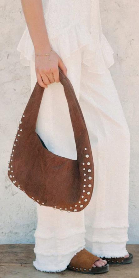 • Artea brown suede studded shoulder bag, $39, lulus.com
