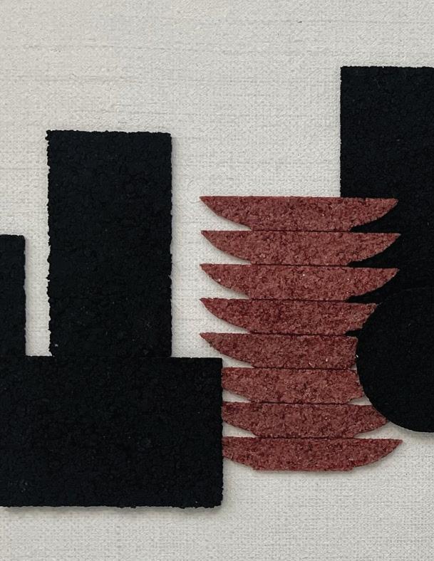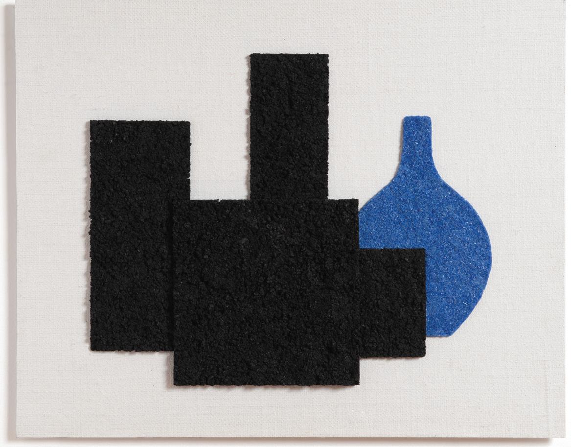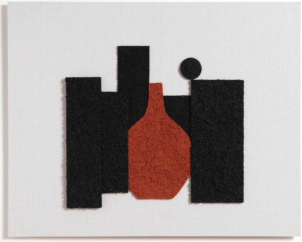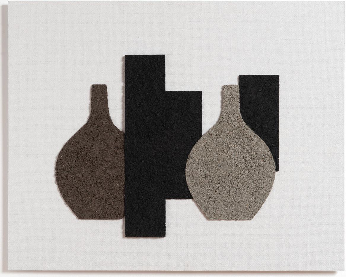 telhas e carvões moídos aplicados em juta pintada com gesso sobre placas de alumínio. Inspirada nas pinturas de natureza-morta de Giorgio Morandi (1890-1964), um dos maiores pintores italianos do século XX, essa série faz referência às imagens de garrafas, de caixas e de esferas, com alguns dos objetos pintados exaustivamente pelo artista. Tendo como homônimo a rua onde Giorgio Morandi tinha sua casa/ateliê em Bolonha, na Itália, a série Via Fondazza tem seus trabalhos numerados conforme os números das casas vizinhas ao ateliê do artista.