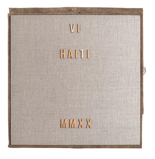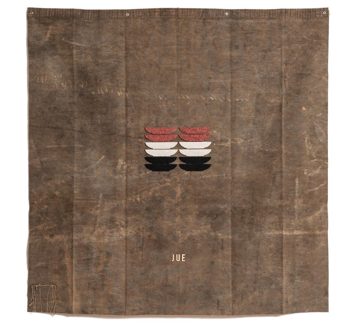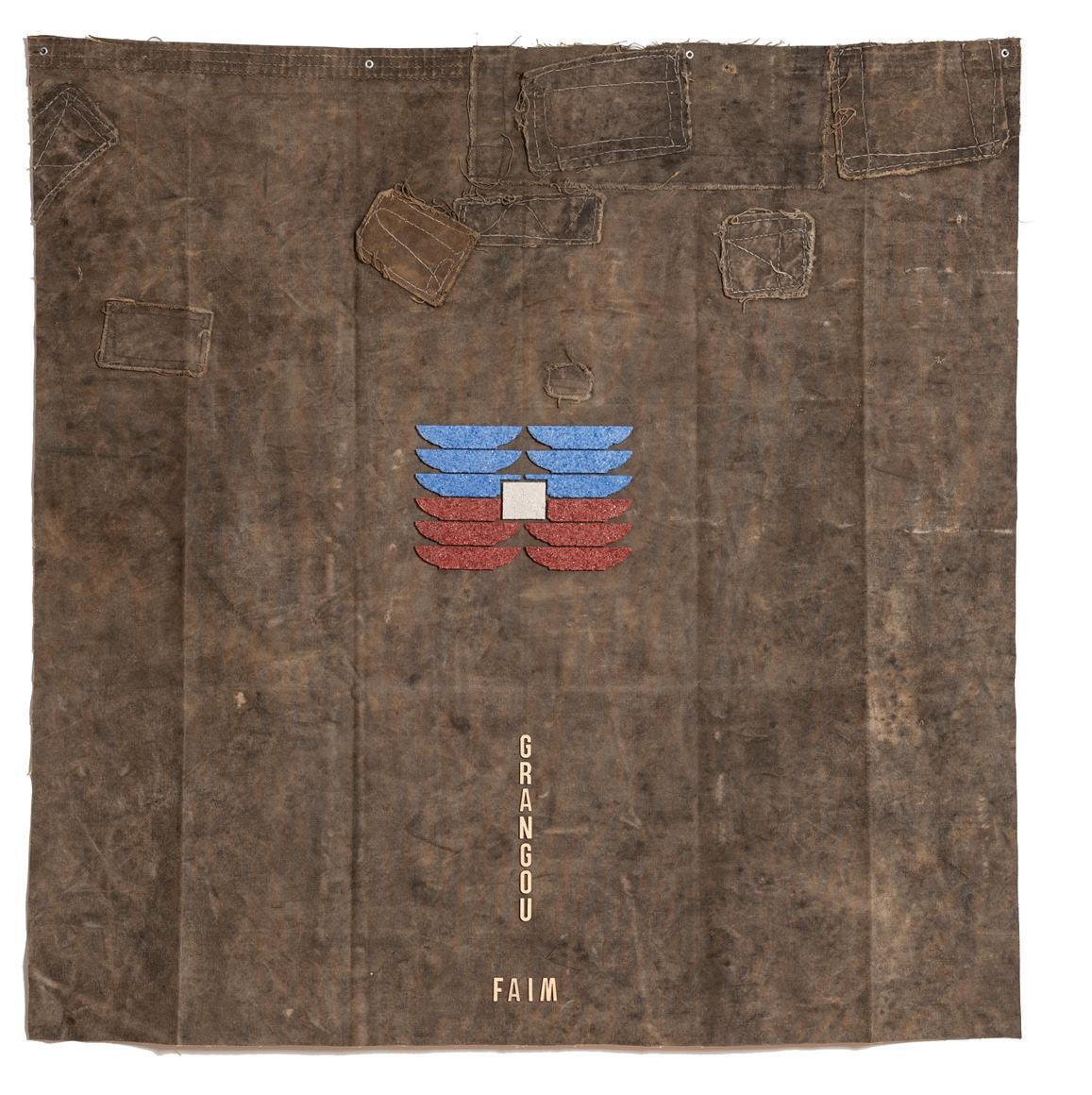 patched tarps (usually used for the construction of shelters) embody Racy’s flags. Following the artist’s own aesthetic which combines geometric abstraction and words, wooden letters write the names of each country and the word “hunger” in their official languages. Once again, the reference to language strikes as a regional symptom, given that both the blind eye and hunger vary according to time and space. All humans are capable of feeling hungry but there is no way of comparing what hunger means today in Congo and Belgium, for example.