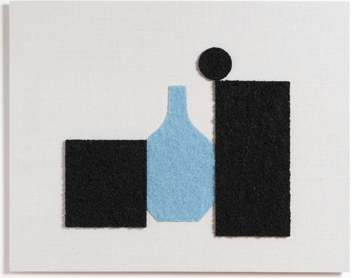 Crushed charcoal and glass bottle on canvas on aluminium plate