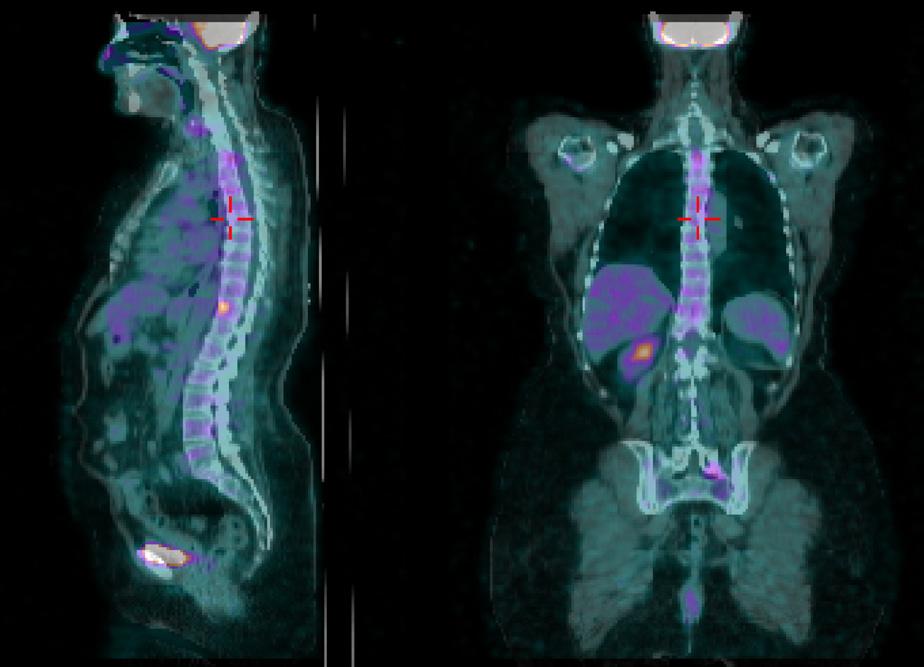La PET di Ottobre 2019 evidenziava caratterizzate da minima attività metabolica le lesioni scheletriche descritte nel corso dei precedenti controlli. È apprezzabile esclusivamente modesta attività metabolica in corrispondenza dell’emisoma sinistro di D11.