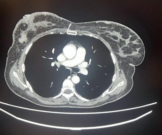 La biopsia mammaria mostra infiltrazione da carcinoma di origine mammaria Ki67 15% ER 7% PgR 0 HT 3+. La successiva TC total body con mdc evidenzia multiple ed ubiquitarie lesioni polmonari oltre la nota lesione mammaria destra. Definita, pertanto, in IV stadio nel mese di Novembre 2020 inizia la terapia di I linea trisettimanale standard con docetaxel associato a pertuzumab e trastuzumab. Dopo i primi tre mesi dall’inizio del trattamento la lesione della mammella va incontro a rimarginazione. Alla TC total body di controllo del mese di Agosto 2021 (figura 2) si osservava netta risposta con riduzione della lesione mammaria e scomparsa delle metastasi polmonari. A partire dal mese di Marzo 2022 la paziente inizia a presentare noduli sottocutanei e linfangite mammaria controlaterale con ricomparsa della nota ulcera mammaria.