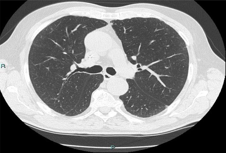 Figura 7. HRTC Ottobre 2023: si rileva la comparsa di ispessimenti interstiziali subpleurici bilateralmente; coesistono alterazioni a vetro smerigliato.