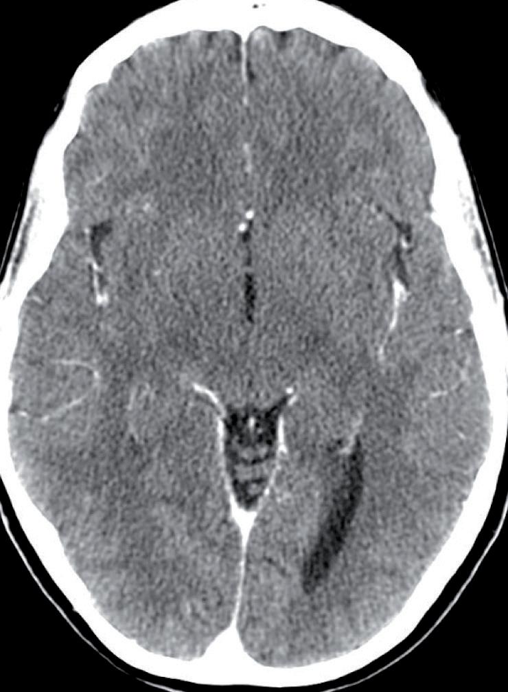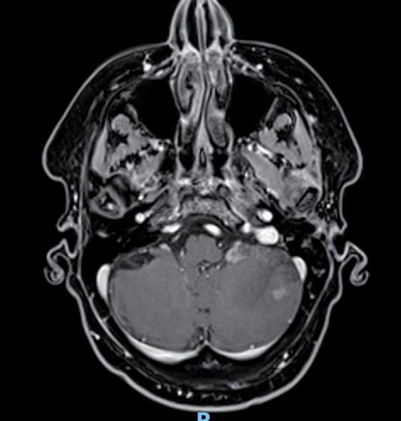 Alla quattordicesima somministrazione, la rivalutazione mediante TC mostra una sostanziale stabilità della malattia epatica e ossea (figura 2). Tuttavia, la RMN encefalica evidenzia un incremento dimensionale della lesione cerebellare sinistra, associata a edema perilesionale (figura 3). Pur in assenza di sintomi neurologici, si decide di avviare una terapia corticosteroidea a scalare per il controllo dell’edema.