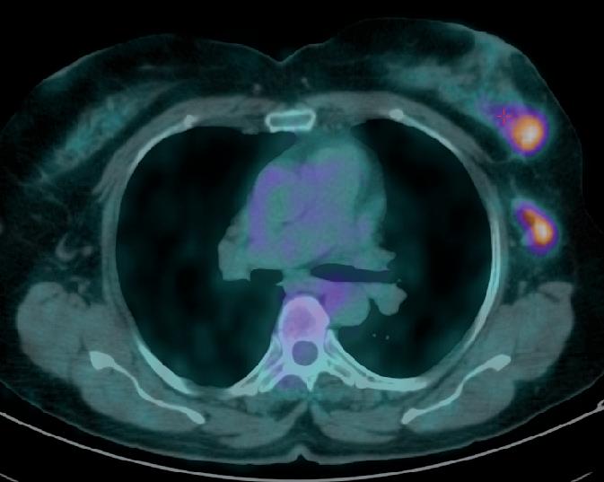La PET (figura 1) metteva in evidenza la presenza di accumulo del tracciante metabolico in corrispondenza della formazione ovalare posta nel quadrante inferoesterno della mammella di sinistra (SUV massimo pari a 5,6). In in sede ascellare monolaterale, ulteriore grossolano linfonodo caratterizzato da analoga attività metabolica (SUV massimo pari a 5,1). Si segnalano inoltre, la presenza di alcune focalità di accumulo del tracciante metabolico di pertinenza scheletrica poste nel soma di D2, D11 e nell’emisacro di sinistra.