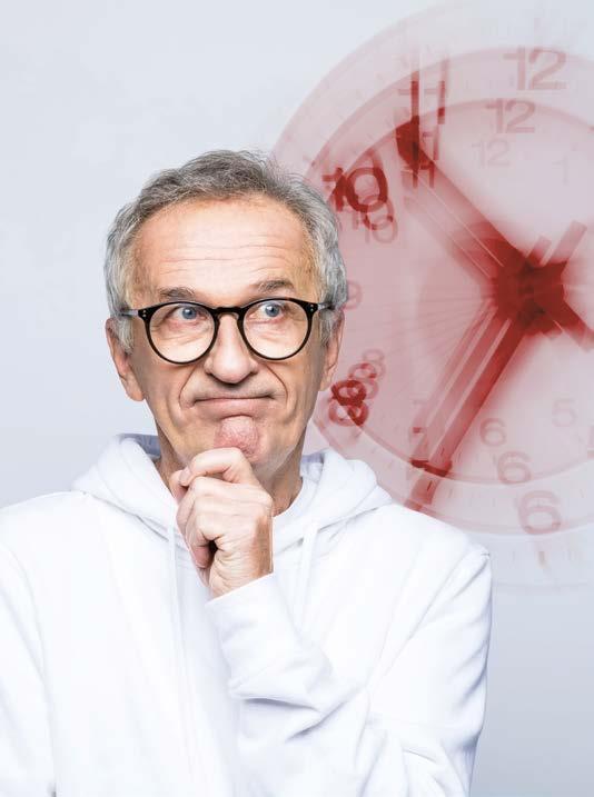 Unsere innere biologische Uhr (zirkadianer Rhythmus) reguliert die Schlaf-WachZyklen und andere wichtige Prozesse im Körper. Veränderungen dieses Rhythmus wirken sich auch auf unser subjektives Zeitgefühl aus. Der Hypothalamus (lebenswichtiger Teil im Zwischenhirn) spielt bei der Kontrolle dieser Uhr eine Schlüsselrolle. Seine Aktivität und Struktur kann sich im Alter ändern, was zu einer Verlangsamung des zirkadianen Rhythmus führen kann. Dies erklärt teilweise, warum ältere Menschen oft das Gefühl haben, dass die Zeit schneller vergeht –ihre biologische Uhr tickt langsamer. Und es erklärt auch, warum wir uns bei Zeitumstellungen (31. März: Umstellung auf Sommerzeit!) so schwer tun, in einen neuen Tagesund Nachtablauf zu finden.