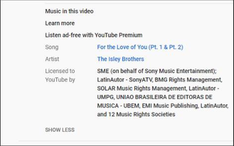Much of this information can be found on YouTube by clicking on “show more” in the video description (figure 1) Correctly licensed YouTube posts will include the song title, artist, and license holders (figure 2). Covers of songs are often cheaper to license than the original versions.