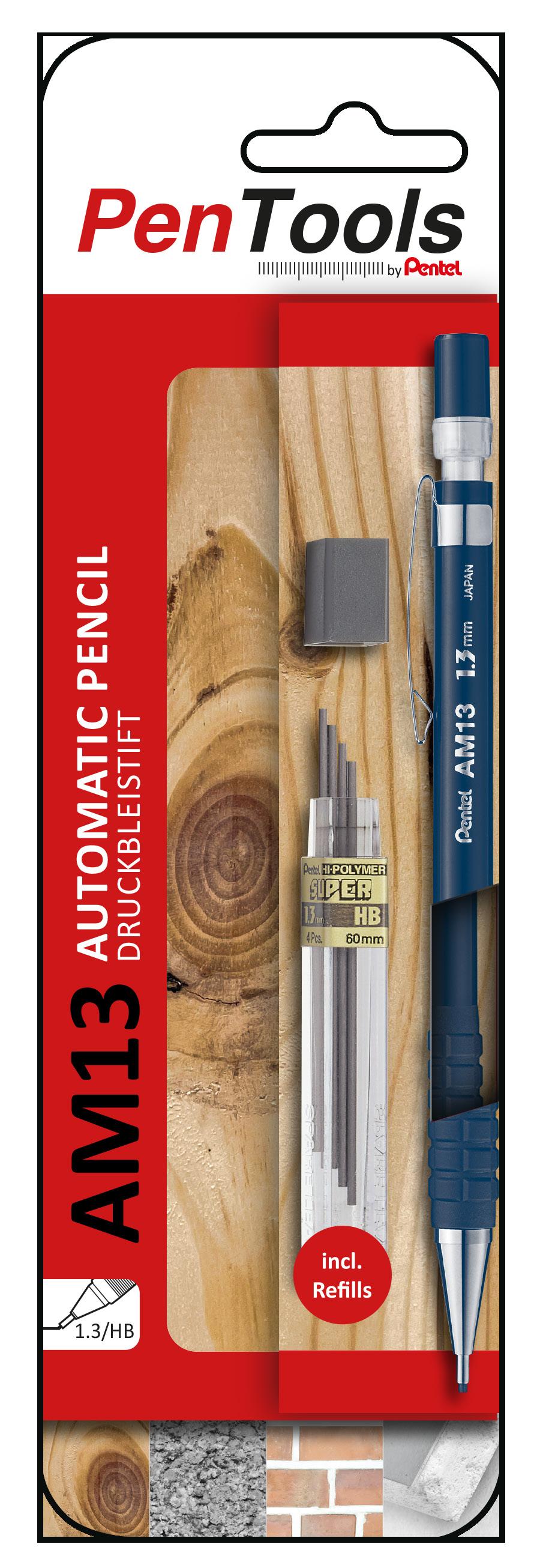 Der Pentel Druckbleistift „AM13“ kombiniert die Vorteile eines Druckbleistifts mit der breiten Strichstärke eines Bleistifts für Handwerker und Schreiner. Anwender profitieren von einem stets präzisen, breiten und gut sichtbaren Strich, ohne die Mine nach Abnutzung anspitzen zu müssen.