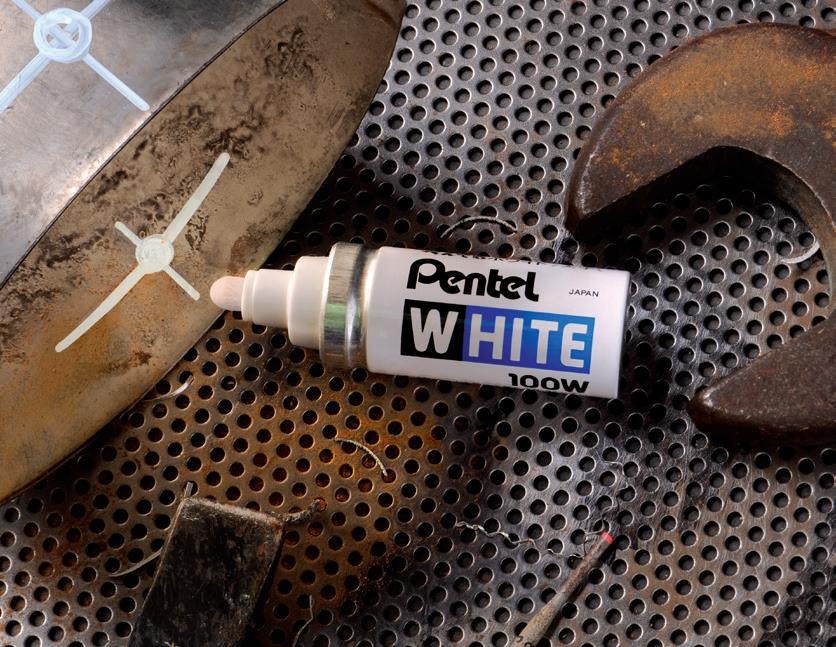 Der kompakte Pentel Lackmarker „White 100W“ mit permanenter Tinte verläuft nicht und trocknet schnell. Der Marker enthält weiße Tinte mit hoher Deckkraft und guter Sichtbarkeit, die auch auf öligen, nassen oder verschmutzen Oberflächen verwendet werden kann.