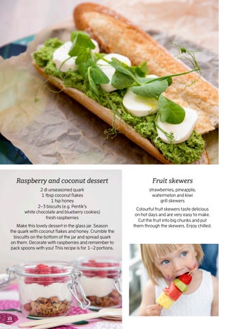2 dl unseasoned quark 1 tbsp coconut flakes 1 tsp honey 2–3 biscuits (e.g. Pentik’s white chocolate and blueberry cookies) fresh raspberries
