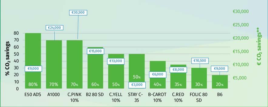 *Examples of CO2 savings based on average vitamin levels used in 100k T feed (DSM Premix Carbon Calculator) **Value of CO2 saving assuming a Carbon Credit or Tax of €50 per tonne CO2