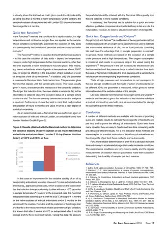 In summary, the Rancimat test is suitable for a quick and costeffective, qualitative comparison of antioxidant efficacy in fats and oils. It is not possible, however, to obtain a plausible estimation of storage life.