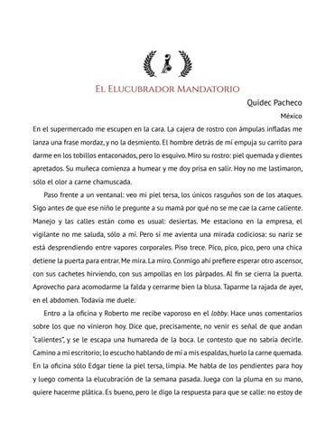 El Elucubrador Mandatorio Quidec Pacheco México En el supermercado me escupen en la cara. La cajera de rostro con ámpulas infladas me lanza una frase mordaz, y no la desmiento. El hombre detrás de mí empuja su carrito para darme en los tobillos entaconados, pero lo esquivo. Miro su rostro: piel quemada y dientes apretados. Su muñeca comienza a humear y me doy prisa en salir. Hoy no me lastimaron, sólo el olor a carne chamuscada. Paso frente a un ventanal: veo mi piel tersa, los únicos rasguños son de los ataques. Sigo antes de que ese niño le pregunte a su mamá por qué no se me cae la carne caliente. Manejo y las calles están como es usual: desiertas. Me estaciono en la empresa, el vigilante no me saluda, sólo a mí. Pero sí me avienta una mirada codiciosa: su nariz se está desprendiendo entre vapores corporales. Piso trece. Pico, pico, pico, pero una chica detiene la puerta para entrar. Me mira. La miro. Conmigo ahí prefiere esperar otro ascensor, con sus cachetes hirviendo, con sus ampollas en los párpados. Al fin se cierra la puerta. Aprovecho para acomodarme la falda y cerrarme bien la blusa. Taparme la rajada de ayer, en el abdomen. Todavía me duele. Entro a la oficina y Roberto me recibe vaporoso en el lobby. Hace unos comentarios sobre los que no vinieron hoy. Dice que, precisamente, no venir es señal de que andan “calientes”, y se le escapa una humareda de la boca. Le contesto que no sabría decirle. Camino a mi escritorio; lo escucho hablando de mí a mis espaldas, huelo la carne quemada. En la oficina sólo Edgar tiene la piel tersa, limpia. Me habla de los pendientes para hoy y luego comenta la elucubración de la semana pasada. Juega con la pluma en su mano, quiere hacerme plática. Es bueno, pero le digo la respuesta para que se calle: no estoy de