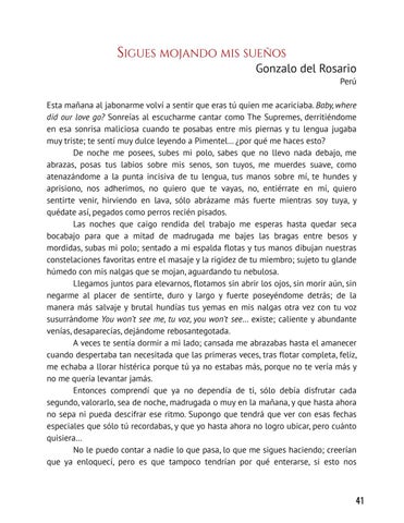 Esta mañana al jabonarme volví a sentir que eras tú quien me acariciaba. Baby, where did our love go? Sonreías al escucharme cantar como The Supremes, derritiéndome en esa sonrisa maliciosa cuando te posabas entre mis piernas y tu lengua jugaba muy triste; te sentí muy dulce leyendo a Pimentel… ¿por qué me haces esto? De noche me posees, subes mi polo, sabes que no llevo nada debajo, me abrazas, posas tus labios sobre mis senos, son tuyos, me muerdes suave, como atenazándome a la punta incisiva de tu lengua, tus manos sobre mí, te hundes y aprisiono, nos adherimos, no quiero que te vayas, no, entiérrate en mí, quiero sentirte venir, hirviendo en lava, sólo abrázame más fuerte mientras soy tuya, y quédate así, pegados como perros recién pisados. Las noches que caigo rendida del trabajo me esperas hasta quedar seca bocabajo para que a mitad de madrugada me bajes las bragas entre besos y mordidas, subas mi polo; sentado a mi espalda flotas y tus manos dibujan nuestras constelaciones favoritas entre el masaje y la rigidez de tu miembro; sujeto tu glande húmedo con mis nalgas que se mojan, aguardando tu nebulosa. Llegamos juntos para elevarnos, flotamos sin abrir los ojos, sin morir aún, sin negarme al placer de sentirte, duro y largo y fuerte poseyéndome detrás; de la manera más salvaje y brutal hundías tus yemas en mis nalgas otra vez con tu voz susurrándome You won’t see me, tu voz, you won’t see… existe; caliente y abundante venías, desaparecías, dejándome rebosantegotada. A veces te sentía dormir a mi lado; cansada me abrazabas hasta el amanecer cuando despertaba tan necesitada que las primeras veces, tras flotar completa, feliz, me echaba a llorar histérica porque tú ya no estabas más, porque no te vería más y no me quería levantar jamás. Entonces comprendí que ya no dependía de ti, sólo debía disfrutar cada segundo, valorarlo, sea de noche, madrugada o muy en la mañana, y que hasta ahora no sepa ni pueda descifrar ese ritmo. Supongo que tendrá que ver con esas fechas especiales que sólo tú recordabas, y que yo hasta ahora no logro ubicar, pero cuánto quisiera… No le puedo contar a nadie lo que pasa, lo que me sigues haciendo; creerían que ya enloquecí, pero es que tampoco tendrían por qué enterarse, si esto nos