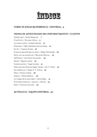 ÍNDICE Torre de Johan Rudisbroeck / editorial …5 Tienda de antigüedades del perverso Mefisto / cuentos Caballo azul / Erika Mergruen …7 El anfitrión / Enrique Urbina …9 La última noche / Andrés Galindo …12 Phantasm / Nelly Geraldine García-Rosas …15 Pic Pic / Yazman Pulido …18 El que se esconde bajo la cama / Edgar Hernández …20 Pacto con los monstruos / Bernardo Monroy ... 24 DelToritos / Ana Paula Rumualdo ... 29 Mamá / Miguel Lupián …30 Cuentacuentos / Ángel Linares …31 Hasta que las letras se hagan ceniza / Ian C. Roditi …33 Eco diferencial / Sergio F. S. Sixtos …36 Reloj / Norma Cuéllar …38 Asesino / Efraím Blanco …40 La trilogía de la oscuridad / Carlos Báez ... 41 El hombre milenario / Ignacio J. Borraz …43 Plató / Francisco de León... 49