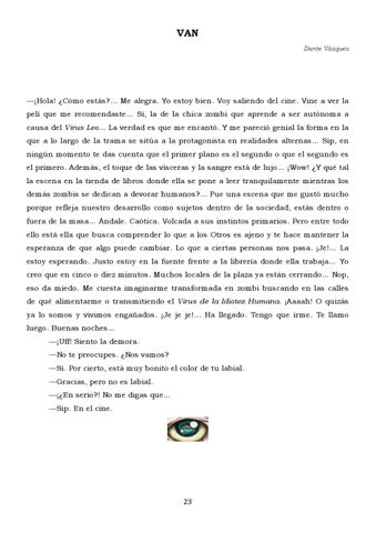 —¡Hola! ¿Cómo estás?... Me alegra. Yo estoy bien. Voy saliendo del cine. Vine a ver la pelí que me recomendaste… Sí, la de la chica zombi que aprende a ser autónoma a causa del Virus Leo... La verdad es que me encantó. Y me pareció genial la forma en la que a lo largo de la trama se sitúa a la protagonista en realidades alternas… Sip, en ningún momento te das cuenta que el primer plano es el segundo o que el segundo es el primero. Además, el toque de las vísceras y la sangre está de lujo… ¡Wow! ¿Y qué tal la escena en la tienda de libros donde ella se pone a leer tranquilamente mientras los demás zombis se dedican a devorar humanos?... Fue una escena que me gustó mucho porque refleja nuestro desarrollo como sujetos dentro de la sociedad, estás dentro o fuera de la masa… Ándale. Caótica. Volcada a sus instintos primarios. Pero entre todo ello está ella que busca comprender lo que a los Otros es ajeno y te hace mantener la esperanza de que algo puede cambiar. Lo que a ciertas personas nos pasa. ¡Je!… La estoy esperando. Justo estoy en la fuente frente a la librería donde ella trabaja… Yo creo que en cinco o diez minutos. Muchos locales de la plaza ya están cerrando… Nop, eso da miedo. Me cuesta imaginarme transformada en zombi buscando en las calles de qué alimentarme o transmitiendo el Virus de la Idiotez Humana. ¡Aaaah! O quizás ya lo somos y vivimos engañados. ¡Je je je!... Ha llegado. Tengo que irme. Te llamo luego. Buenas noches… —¡Uff! Siento la demora. —No te preocupes. ¿Nos vamos? —Sí. Por cierto, está muy bonito el color de tu labial. —Gracias, pero no es labial. —¡¿En serio?! No me digas que… —Sip. En el cine.