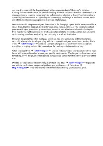 However, designing the perfect front page layout can be a time-consuming and frustrating task, especially when you're already grappling with the complexities of your research and writing. That's where ⇒ HelpWriting.net⇔ comes in. Our team of experienced academic writers and editors specializes in helping students like you navigate the challenges of dissertation writing.