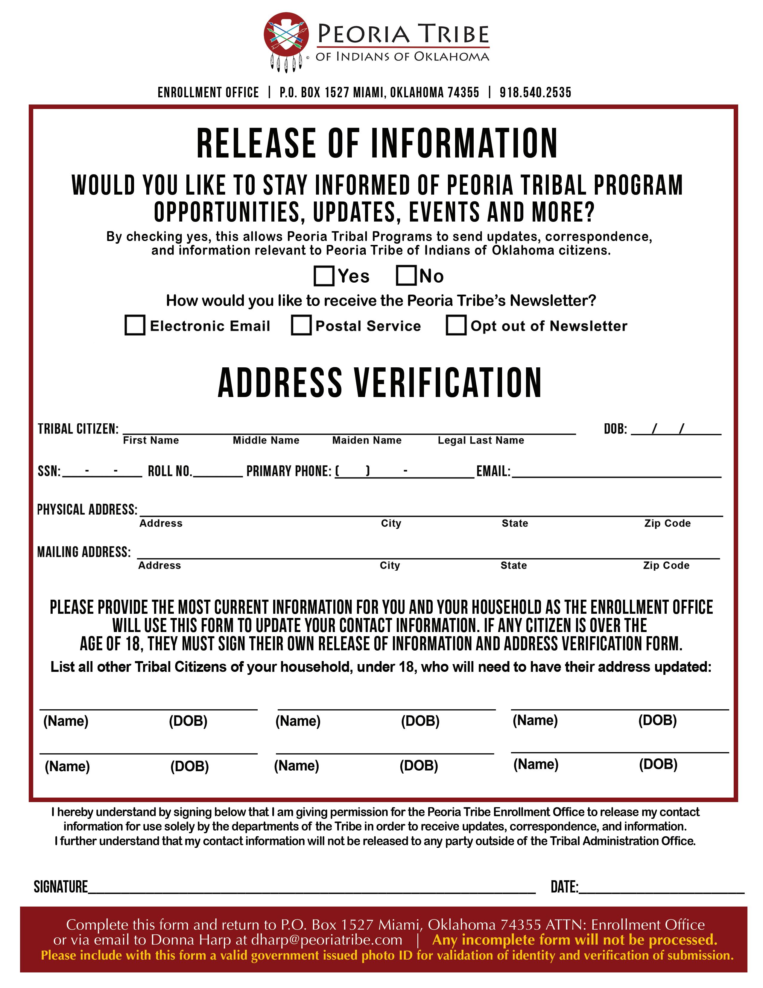 • Individual must be a current enrolled living citizen of the Peoria Tribe, 65 years or older, evidenced by a Photo ID.