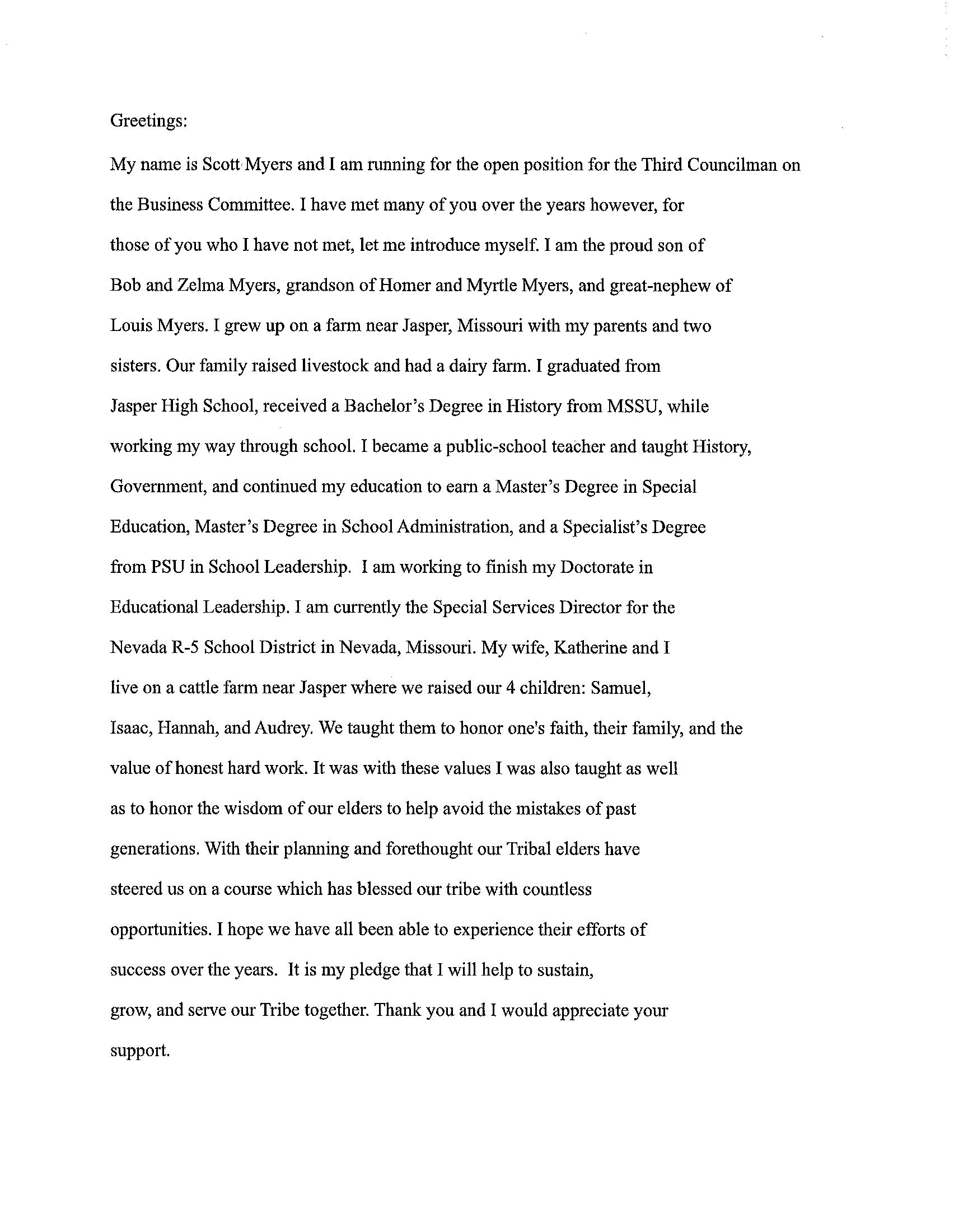 I would greatly appreciate your support to continue representing the interest of the citizens and the well being of the tribe as Third Councilman of the Peoria Tribe of Indians of Oklahoma.