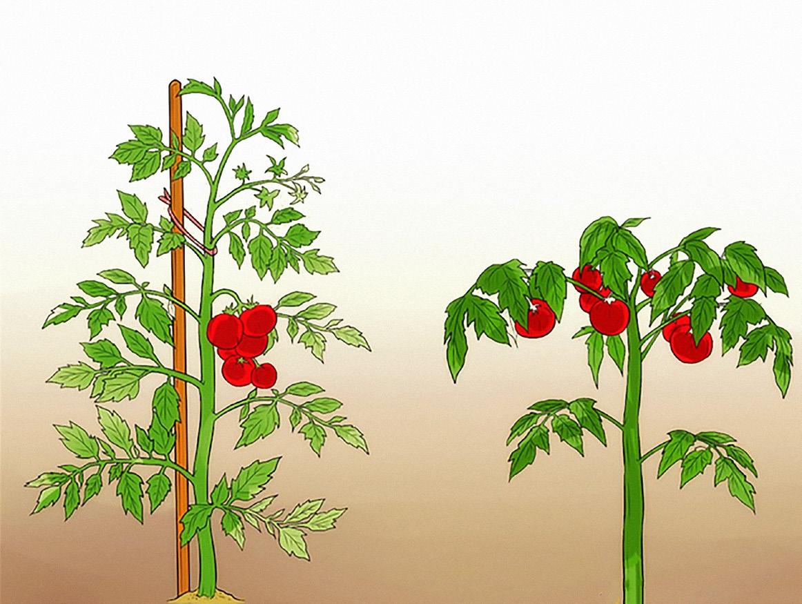 Next, you need to decide how you plan to support your tomato plants. Tomato varieties will be listed as either determinate or indeterminate plants (Figure 4). Determinate (or bush) tomatoes will grow to a certain size and stop. They are bred to stop growing when they are 3 to 4 feet tall, and most of the fruit will ripen together. Indeterminate tomato plants will keep growing for months and months and usually require more management because they produce secondary shoots that are often trimmed by the gardener and their fruit ripens in stages as the vine grows longer and longer. Indeterminate plants can grow very tall or be grown along a large trellis whereas determinate tomato plants often just need a tomato cage or staking to support them.