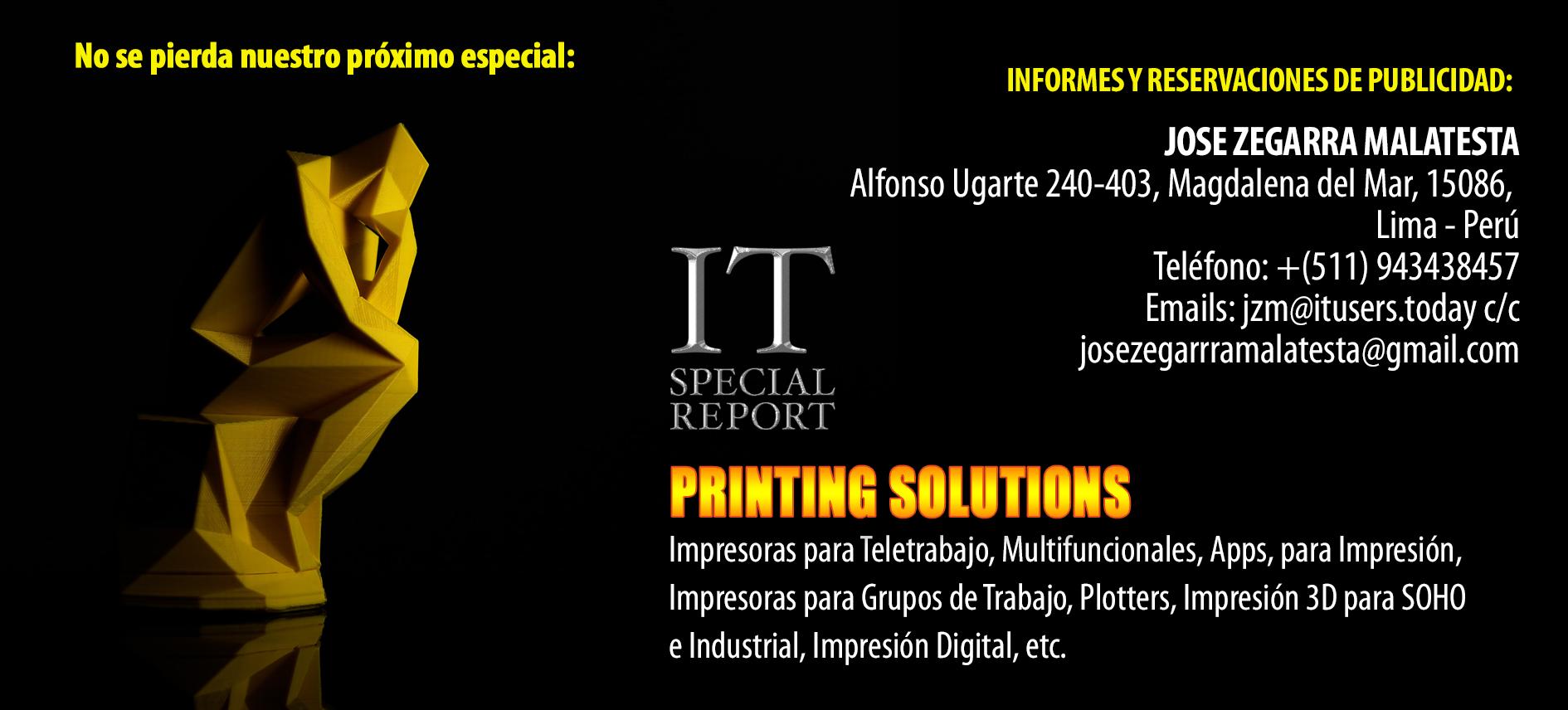 Los servicios y productos presentados en esta revista son a nivel de información y no constituyen recomendación alguna por parte de IT/USERS®. Las opiniones vertidas en los artículos reflejan el particular punto de vista de sus Autores y la revista no se solidariza necesariamente con ellos. IT/USERS es una Marca Registrada propiedad de JZM & Asociados SAC. Queda terminantemente prohibida la reproducción total o parcial del contenido de IT/USERS sin autorización por escrito de los Editores.
