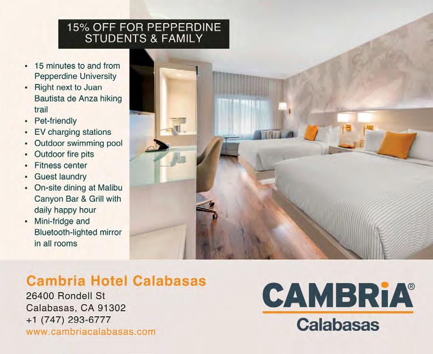 38 | Parent and Family Guide 2023–2024 Immerse yourself in Pepperdine’s Malibu campus, enjoy breathtaking panoramic ocean views, and be moments away from Malibu beaches and shopping when you stay at the Villa Graziadio Executive Center. The Villa is the perfect location for families and offers all the amenities you need for a relaxing stay on the California coast. PREFERRED RATES for Pepperdine Parents, Students, and Alumni 24255 Pacific Coast Highway, Malibu, CA 90263 | 310.506.1100 VILLAGRAZIADIO.COM