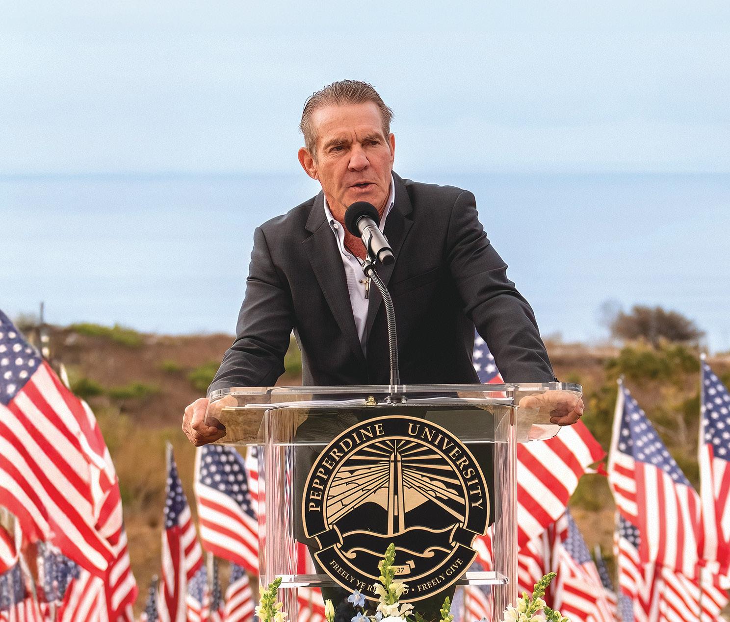 Actor Dennis Quaid gave the keynote address at Pepperdine’s 17th annual 9/11 Remembrance Ceremony. Speaking before 400 attendees and nearly 3,000 flags that make up the University’s annual Waves of Flags display on Alumni Park, Quaid hailed the selflessness and bravery of those who responded to the disaster, recognizing their willingness to risk their own lives to save those of strangers. Following remarks from administrators and students, Quaid joined Eric Leshinsky, Pepperdine director of student veteran affairs and Jennifer Seetoo, a commander of the Los Angeles Sheriff’s Department, in a ceremonial planting of the final flag.