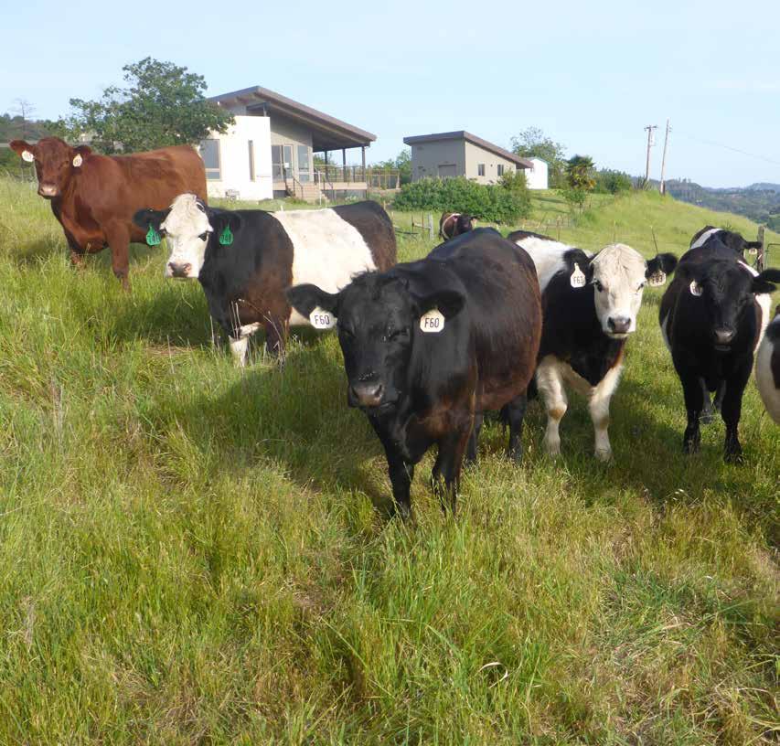 OPPOSITE: Markegard Family Grass-fed’s galloway cattle, grazing in front of the newly built Preserve Manager’s homestead at Pepperwood.