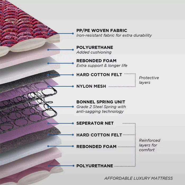 Engineered with high-quality Bonnell springs, the Peps Spring Koil Mattress maintains its shape and resilience for long-lasting comfort.