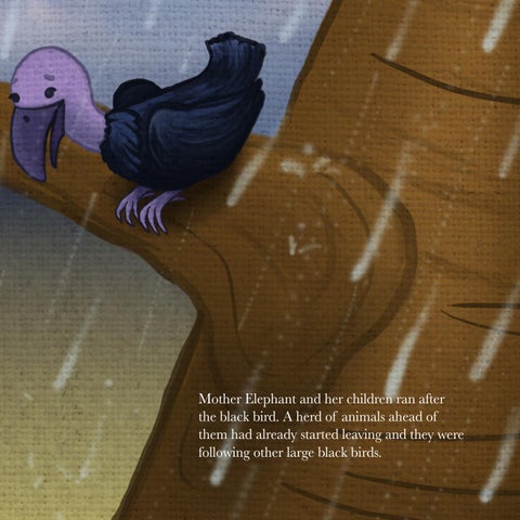 Mother Elephant and her children ran after the black bird. A herd of animals ahead of them had already started leaving and they were following other large black birds.