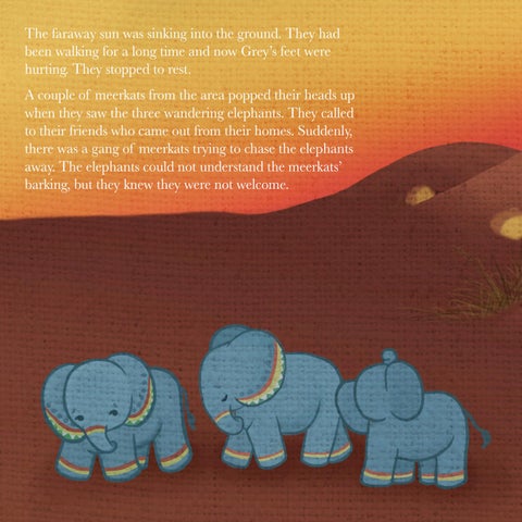 The faraway sun was sinking into the ground. They had been walking for a long time and now Grey’s feet were hurting. They stopped to rest. A couple of meerkats from the area popped their heads up when they saw the three wandering elephants. They called to their friends who came out from their homes. Suddenly, there was a gang of meerkats trying to chase the elephants away. The elephants could not understand the meerkats’ barking, but they knew they were not welcome.