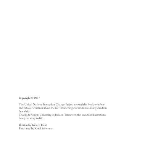 Copyright © 2017 The United Nations Perception Change Project created this book to inform and educate children about the life-threatening circumstances many children face daily. Thanks to Union University in Jackson Tennessee, the beautiful illustrations bring the story to life. Written by Kirsten Deall Illustrated by Kayli Sommers