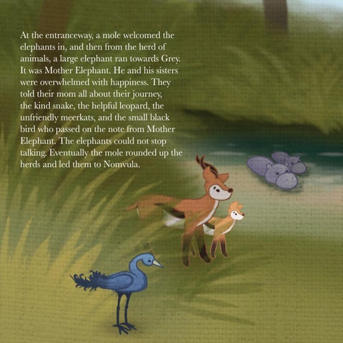 At the entranceway, a mole welcomed the elephants in, and then from the herd of animals, a large elephant ran towards Grey. It was Mother Elephant. He and his sisters were overwhelmed with happiness. They told their mom all about their journey, the kind snake, the helpful leopard, the unfriendly meerkats, and the small black bird who passed on the note from Mother Elephant. The elephants could not stop talking. Eventually the mole rounded up the herds and led them to Nomvula.