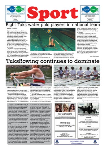 MAXINE TWADDLE TuksRowing won the 2013 National Rowing Championships held over the weekend of 26-28 April at Roodeplaat Dam in Pretoria. TuksRowing dominated throughout the competition. Lindsey Davis recorded Tuks’s first victory in the weekend’s events when she won the women’s A 2× event with her partner with a time of 8:12.16 minutes. David Hunt won the men’s A 1× in 7:25.05 minutes. Fellow Rowing is one of the oldest sports at the Olympics. It is a technical sport that requires competitors to have physical strength and a high level of fitness. There are two forms of rowing: sweep, where each rower in a team of two, four or eight uses one oar held by both hands, and sculling, where an individual rower or each rower in a team of two or four uses two oars. The boats used in competitive rowing are called shells. These are classified according to how many rowers they can accommodate and whether there is a coxswain in the boat. The coxswain is the rower who sits in the stern of the boat. The coxswain is in charge of steering the boat and coordinating the power output and rhythm of the other rowers. It is a rowing tradition to throw the coxswain into the water if the team wins. In an 8+ boat, each seat is labelled one to eight starting from the stern. This defines the role of the rower in each position. The rowers in positions eight and seven form the stern pair. The eighth rower sits closest to the boat’s stern. Called the stroke, this rower sets the rhythm for the rest