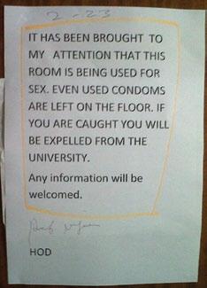 The notice on the door of room 2-23, signed by Viljoen, warns students that if they are caught, they will be immediately expelled.