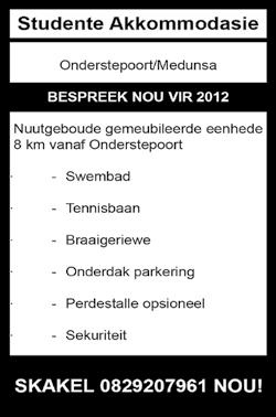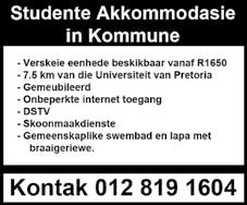 events in recent years and has partially funded the National Serenade Competition which will be held at Tuks this week. The 2012 orientation schedule has been reorganized to ensure that there will be space for Ienk Melodienk and that it does not clash with Rag. “Surely the university would not have provided nancial and other support for events it intends to discontinue,” Mulder said.