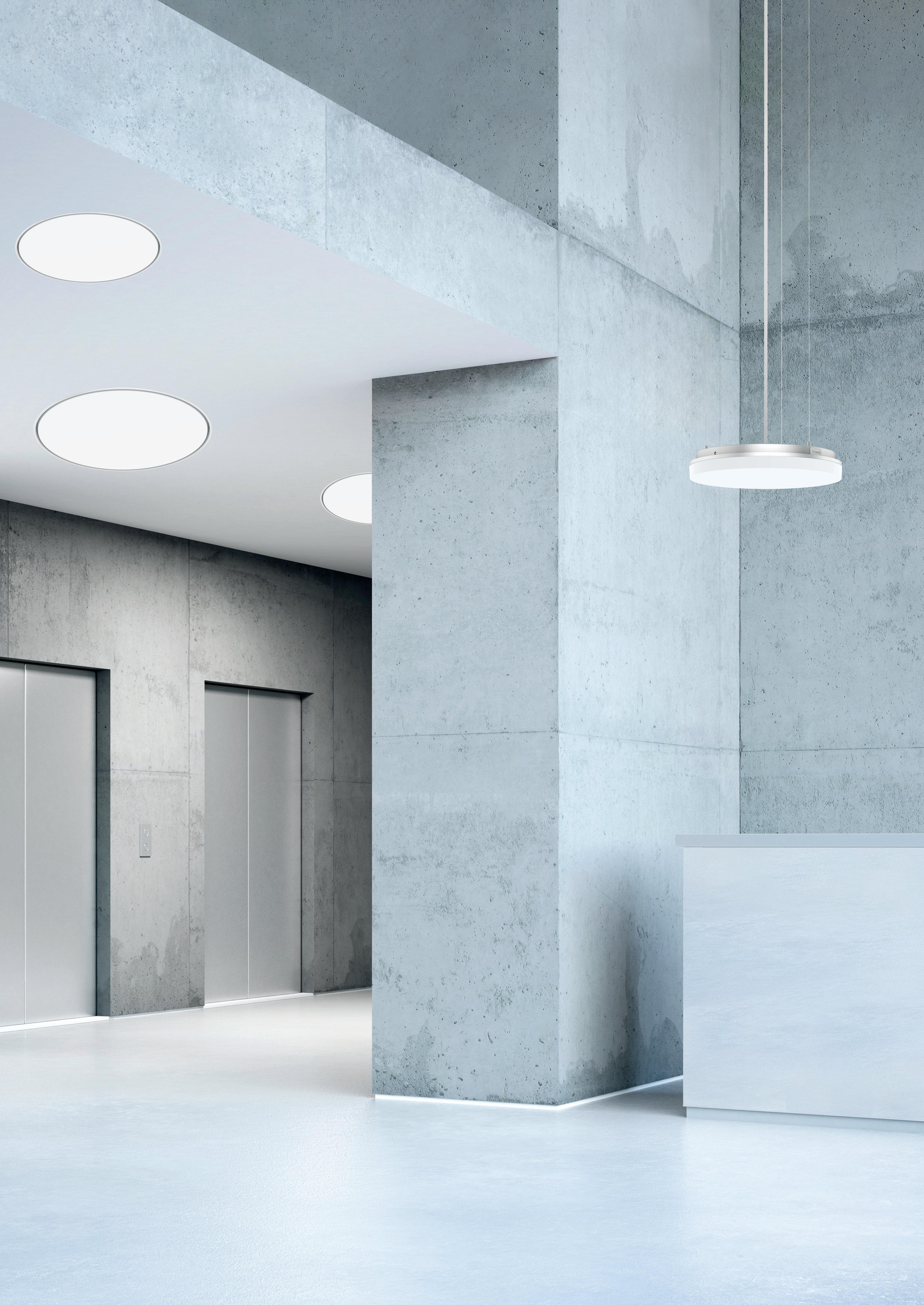 With the effect-enhancing accessory "built-in flex," the LIBRE CIRCLE 2.0 ® ceiling luminaire can be flexibly integrated into the ceiling. The luminaire can either extend slightly from the ceiling, acting as an architectural element, or be fully recessed, making the light appear to emanate solely from the ceiling cutout.
